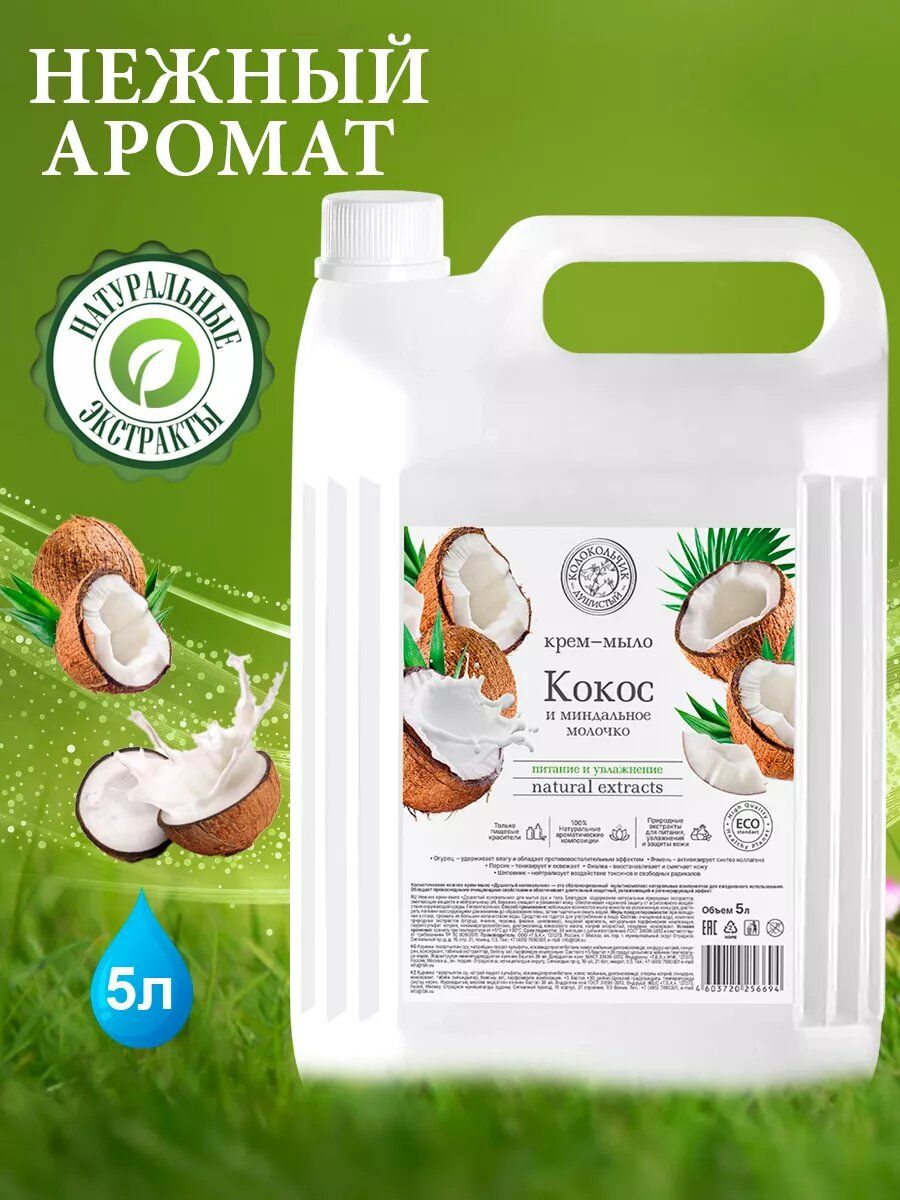 Жидкое крем-мыло «Душистый колокольчик» с ароматом кокоса и миндаля для мытья рук и тела. Содержит большое количество смягчающих веществ, очищает кожу и оказывает защитное действие от агрессивного воздействия окружающей среды. Расслабляющий аромат крем-мыла подарит ощущение спокойствия и беззаботности. Крем-мыло не сушит кожу, это мягкое очищающее средство, которое сокращает вероятность появления раздражения или сухости кожи.