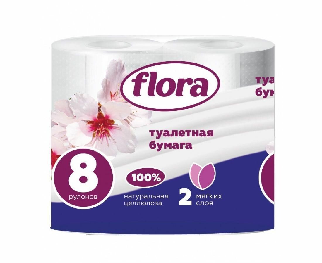 Читать все статьиТуалетная бумага «FLORA» 8 рулонов 2 слоя КУБИК
